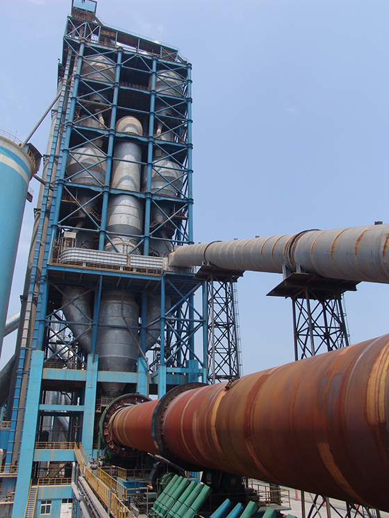 回轉窯是由鋼板卷制的圓筒,內砌耐火磚,由裝車簡體上的輪帶和下面的托輪支承,用裝在窯身上的大齒圈傳動。回轉窯通常以3.5%的斜度安放,轉數一般在1轉/分鐘以內、新式干法窯可達3轉/分鐘以上。單筒冷卻機與窯相似,不同的是筒內裝有揚料板用以加速熟料冷卻。窯頭高溫區(qū)簡體溫度過高,以前曾用水冷卻,現已改為用風冷卻。