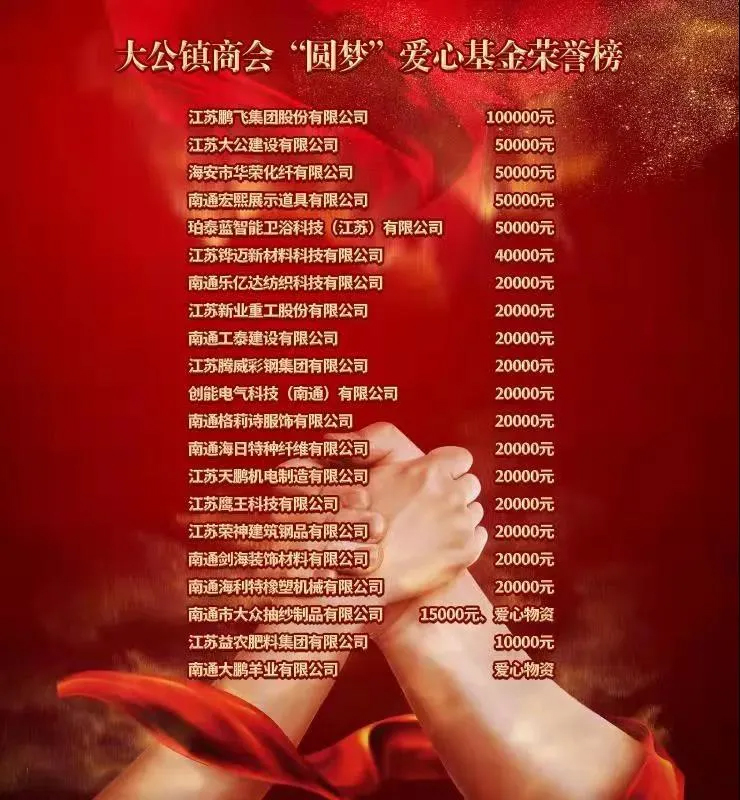 海安市政協(xié)副主席、市工商聯(lián)主席蔡祝平,大公商會(huì)會(huì)長(zhǎng)、鵬飛集團(tuán)董事長(zhǎng)王家安共同為愛心基金揭牌,宣布大公鎮(zhèn)商會(huì)“圓夢(mèng)”愛心基金正式成立!前期,大公鎮(zhèn)商會(huì)21家副會(huì)長(zhǎng)單位共計(jì)籌集60.5萬元愛心善款,所募集資金主要用于:幫助困境青少年、開展青少年公益實(shí)踐等活動(dòng)。