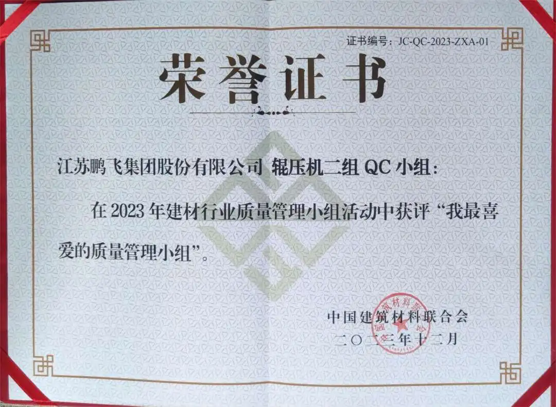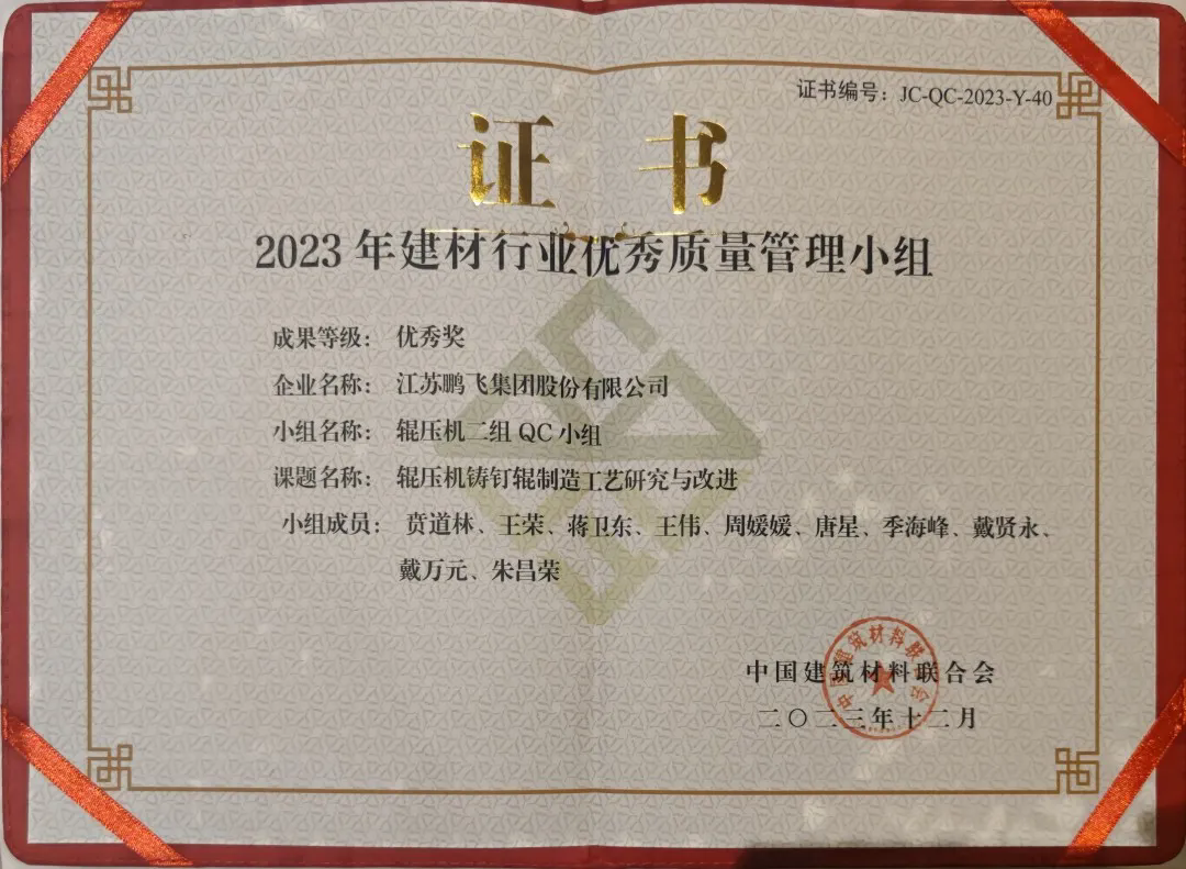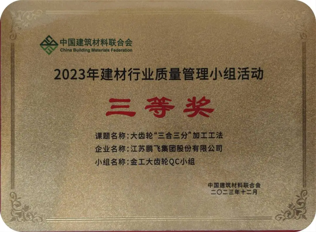 近期,中國建筑材料聯(lián)合會(huì)組織召開第三十九次建材行業(yè)質(zhì)量管理小組代表大會(huì)暨質(zhì)量信得過班組經(jīng)驗(yàn)交流大會(huì),會(huì)上頒發(fā)了2023年建材行業(yè)優(yōu)秀質(zhì)量管理小組和質(zhì)量信得過班組、先進(jìn)個(gè)人和優(yōu)秀組織榮譽(yù)證書。鵬飛金工大齒輪“三合三分”加工工法獲得“2023年建材行業(yè)優(yōu)秀質(zhì)量管理小組三等獎(jiǎng)”;輥壓機(jī)二組QC小組的輥壓機(jī)鑄釘輥制造工藝研究與改進(jìn)獲得“2023年建材行業(yè)優(yōu)秀質(zhì)量管理小組優(yōu)秀獎(jiǎng)”,同時(shí)QC小組獲評(píng)“我最喜愛的質(zhì)量管理小組”。