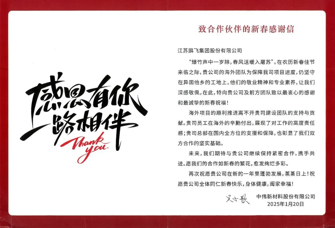 江蘇鵬飛集團在項目履約中用行動做到客戶滿意,以優(yōu)質(zhì)履約作為品牌支撐,收到來自客戶的感謝信。信中,客戶對我司交付的項目質(zhì)量和效率表達了高度肯定和認可,更對鵬飛項目負責團隊的認真負責態(tài)度、專業(yè)技術能力、高效執(zhí)行能力給予了高度的評價和贊賞。