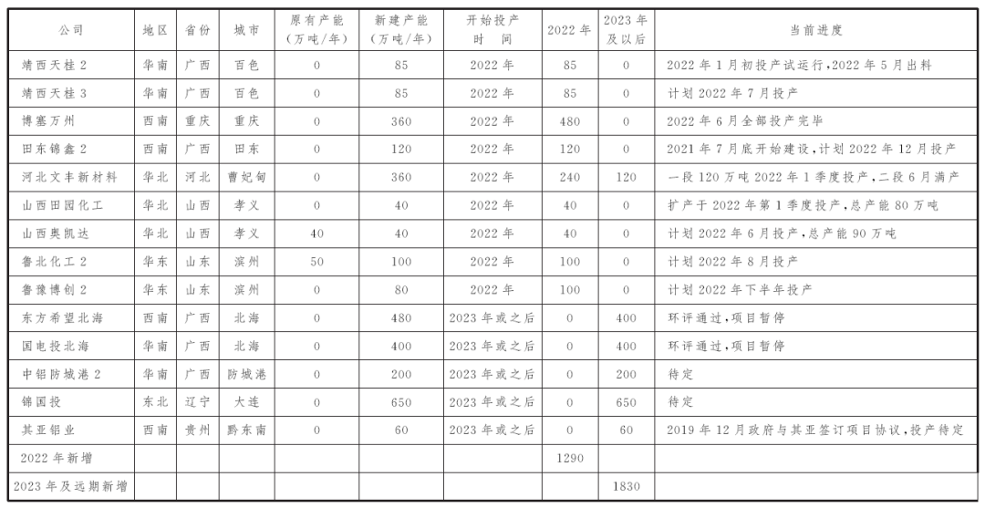 預(yù)計(jì)2022年新投氧化鋁產(chǎn)能將達(dá)到1290萬噸,在下半年產(chǎn)能繼續(xù)保持快速增加的形勢下,氧化鋁后續(xù)價(jià)格或存在下行壓力。