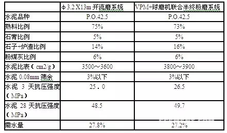 關(guān)于水泥質(zhì)量,我們與該廠老生產(chǎn)線(φ3.2 X13m開(kāi)流磨系統(tǒng))所生產(chǎn)的水泥進(jìn)行對(duì)比,結(jié)果如下: