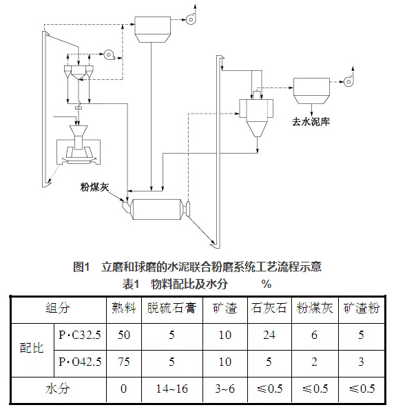 淶水冀東水泥有限公司3個(gè)水泥粉磨系統(tǒng)均采用JLMS-24.3立磨與Φ4.8m×9.5m球磨機(jī)組成聯(lián)合粉磨系統(tǒng)。JLMS-24.3立磨裝機(jī)功率2240kW,磨盤(pán)中徑2400mm,3個(gè)磨輥,磨盤(pán)轉(zhuǎn)速33.58r/min,產(chǎn)量210t/h,入料粒度≤30mm;配套選粉機(jī)JXF4100GY,成品量180~220t/h,比表面積≥200m2/kg,最大喂料量600t/h,通過(guò)氣體溫度≤150℃,通風(fēng)量(70~90℃)180000m3/h;球磨機(jī)Φ4.8m×9.5m,裝機(jī)功率3550kW,產(chǎn)量180t/h,生產(chǎn)P·O42.5水泥時(shí),比表面積360~380 m2/kg;配套O-Sepa選粉機(jī),通風(fēng)量240000m3/h,最大通過(guò)量720t/h。水泥粉磨系統(tǒng)工藝流程見(jiàn)圖1,系統(tǒng)設(shè)計(jì)指標(biāo):生產(chǎn)P·O42.5水泥,臺(tái)時(shí)產(chǎn)量180t/h,分步電耗35.5kWh/t,比表面積360m2/kg,生產(chǎn)P·C32.5水泥,臺(tái)時(shí)產(chǎn)量240t/h,分步電耗26.6kWh/t,比表面積370m2/kg。物料配比及相應(yīng)的水分情況見(jiàn)表1。