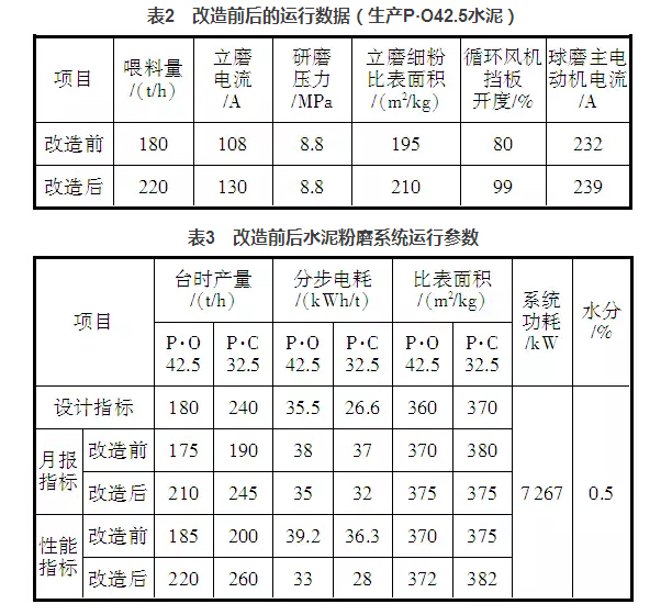 通過(guò)以上幾個(gè)方面的整改,水泥粉磨系統(tǒng)的臺(tái)時(shí)產(chǎn)量有了明顯提升,表2是改造前后的運(yùn)行數(shù)據(jù),表3是水泥粉磨系統(tǒng)改造前后操作參數(shù)對(duì)照。