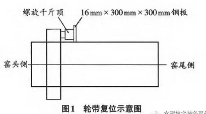 (1)輪帶復(fù)位。用四塊300mm×300mm×16mm的鋼板均勻布焊在一檔輪帶窯尾側(cè)距輪帶500mm處,作為支撐千斤頂?shù)牡鬃?/div>