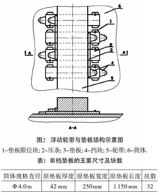 我公司生產(chǎn)的回轉窯采用浮動輪帶支撐窯筒體,輪帶是實心矩形斷面活套套在筒體上,加固窯筒體,見圖1。輪帶與筒體之間均勻分布著32塊墊板,避免輪帶內(nèi)表面與筒體外表面直接接觸。圖2為浮動輪帶與墊板結構示意圖。表1為Ⅲ檔原墊板 的主要尺寸及塊數(shù)。在回轉窯運轉過程中,筒體、輪帶和墊板之間留有一定的間隙。表2為輪帶內(nèi)徑與墊板外徑之間的間隙,這樣必然引起輪帶與筒體墊板之間產(chǎn)生滾動和滑移。我公司生產(chǎn)的回轉窯已運轉僅年,墊板與輪帶內(nèi)圈均有不同程度的磨損,使輪帶起不到加固筒體作用,造成筒體橫截面變形增大,同時輪帶和墊板之間產(chǎn)生很大滑移,已超過極限值,致使限制輪帶軸向竄動的壓條頻繁被推掉。