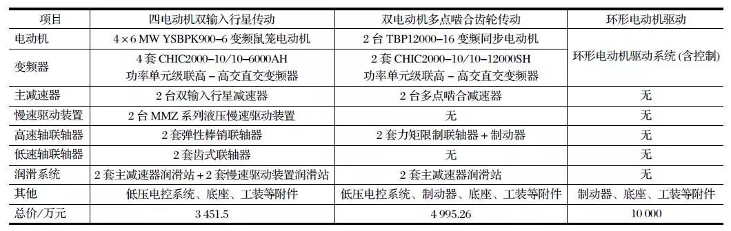 針對(duì) 20 MW 級(jí)大型磨機(jī)驅(qū)動(dòng)方案,以 φ12.2 m× 8.8 m 半自磨機(jī)為例,對(duì)四電動(dòng)機(jī)雙輸入行星傳動(dòng)、雙電動(dòng)機(jī)多點(diǎn)嚙合齒輪傳動(dòng)及環(huán)形電動(dòng)機(jī)驅(qū)動(dòng)方案進(jìn)行成本分析,這 3 種傳動(dòng)方案的機(jī)械和電控液壓系統(tǒng)配置及造價(jià)對(duì)比如表 2 所列。由表 2 可知,四電動(dòng)機(jī)雙輸入行星傳動(dòng)造價(jià)最低,雙電動(dòng)機(jī)多點(diǎn)嚙合齒輪傳動(dòng)造價(jià)居中,環(huán)形電動(dòng)機(jī)驅(qū)動(dòng)方案價(jià)格遠(yuǎn)高于前兩種方案。