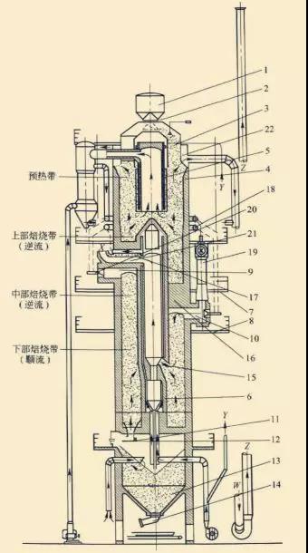 1.料斗;2.料口;3.加料斗;4.外筒;5.上內(nèi)筒;6.下內(nèi)筒;7.上燒嘴平臺(tái);8.下燒嘴平臺(tái);9.上燃燒室;10.下燃燒室;11.液壓推桿系統(tǒng);12.出料臺(tái);13.石灰倉(cāng);14.振動(dòng)出料機(jī);15.循環(huán)氣體入口;16.拱橋;17.冷卻梁;18.環(huán)形管道;19.噴射器;20.燒嘴;21.循環(huán)氣體管道;22.環(huán)形煙道。