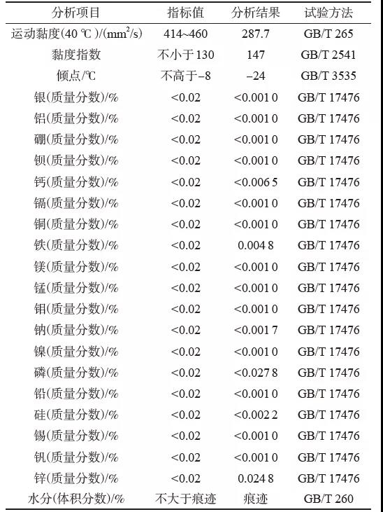 現(xiàn)場檢查發(fā)現(xiàn),磨輥腔體內(nèi)部油品發(fā)黑、油品黏度較低,現(xiàn)場對油品取樣進行分析,結(jié)果如表1所示。由表1可以看出,該牌號油品40 ℃正常的運動黏度應該在460 mm2/s,實測值為287.7 mm2/s,水分超標,潤滑油本身碳化嚴重,品質(zhì)下降,鐵與鋅雜質(zhì)含量增加。從分析結(jié)果判斷,該型立磨使用的油品已不滿足磨輥軸承正常運行所需要的油品條件。