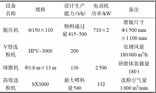 1 試驗(yàn)粉磨系統(tǒng)基本情況主要設(shè)備配置及性能見表1,物料配比及細(xì)度指標(biāo)見表2。