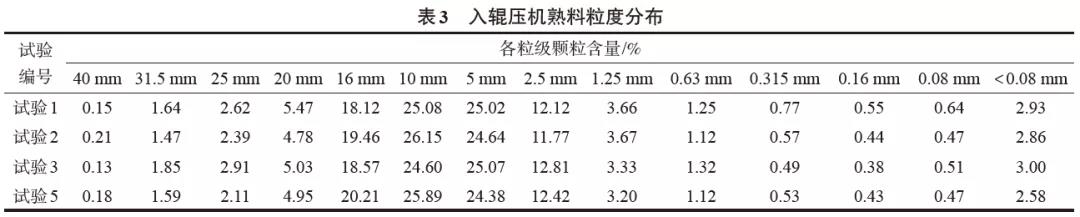 4 試驗(yàn)數(shù)據(jù)的比較和說明4.1 試驗(yàn)過程中輥壓機(jī)物料顆粒組成變化