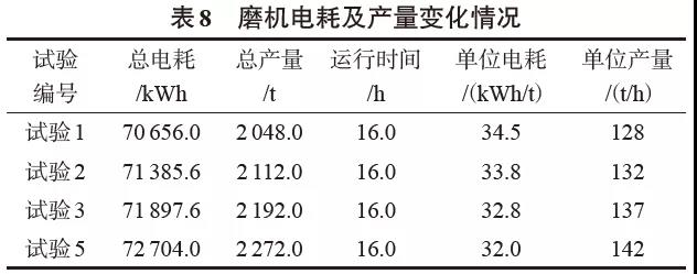 5 效益分析試驗(yàn)過程中粉磨系統(tǒng)的電耗及產(chǎn)量變化見表8。