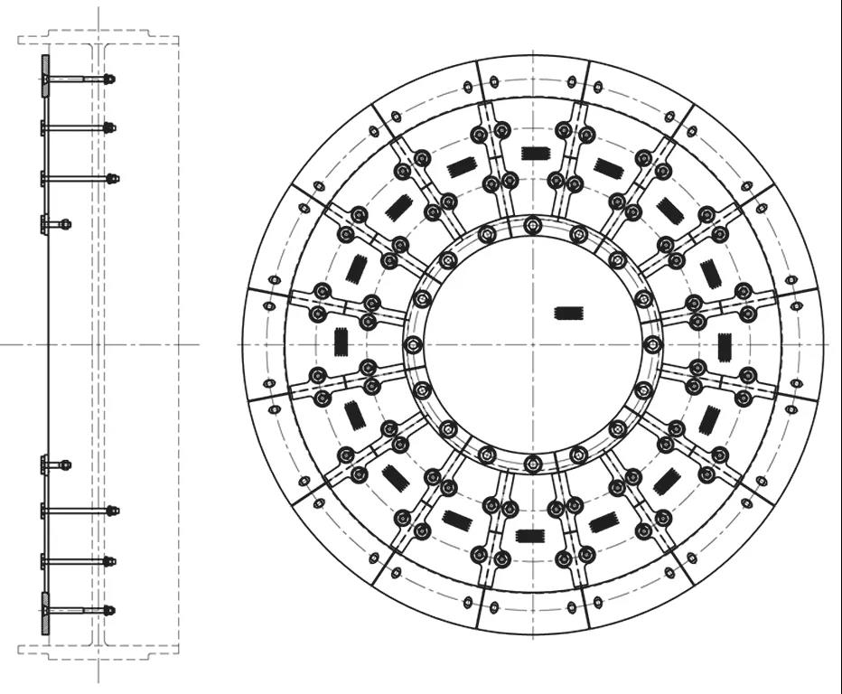 優(yōu)化后的筒體襯板如圖 2 所示。一倉仍采用溝槽階梯襯板,階梯的高度差決定了襯板的提升能力,溝槽的波紋兼顧研磨作用。優(yōu)化后襯板的階梯高度差為100 mm,溝槽的半徑為 R20 mm,深度為 10 mm,提高了襯板的提升和研磨效率,可更好地發(fā)揮一倉以細碎為主、研磨為輔的作用。二倉為小波紋襯板+5 圈活化襯板。小波紋襯板的波紋重新設(shè)計,波峰波谷高度差為 15 mm,盡可能地增大研磨面積,以提高二倉的研磨效率,增強研磨能力??紤]研磨體填充率為30%,活化襯板高度為 750 mm,環(huán)數(shù)增加至 5 圈,重新排列活化襯板的安裝位置 (見圖 3),每一圈的活化襯板交錯排列,可更好地發(fā)揮研磨體的粉磨能力,最大程度消除研磨死區(qū);合理設(shè)計活化襯板的過料面積,將靠近筒體外圓高度為 150 mm的部分設(shè)計成盲板,可有效控制物料在磨內(nèi)的研磨時間,提高磨機研磨效率和物料的磨細程度,降低循環(huán)負荷,從而提高產(chǎn)量、降低電耗。