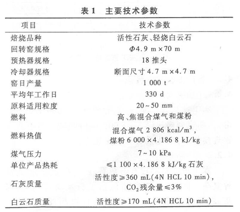 石灰石/白云石進人預(yù)熱器后經(jīng)窯尾約1100 ℃的煙氣預(yù)熱,其中一部分石灰石/白云石在預(yù)熱器中分解。預(yù)熱的物料由液壓推桿推出,經(jīng)轉(zhuǎn)運溜槽進入回轉(zhuǎn)窯中,物料在回轉(zhuǎn)窯內(nèi)經(jīng)過焙燒分解,焙燒好的石灰/白云石進入豎式冷卻器,由底部送入的冷空氣冷卻后通過振動給料機排至集料斗,再經(jīng)成品鏈斗機送往成品系統(tǒng)。冷空氣在冷卻器內(nèi)冷卻物料的同時被加熱,經(jīng)窯頭罩進入窯內(nèi),作為燃料燃燒的二次空氣參與燃燒?;剞D(zhuǎn)窯所用燃料經(jīng)由煤氣和煤粉管道分別送至回轉(zhuǎn)窯窯頭廠房,通過燒嘴從窯頭進入回轉(zhuǎn)窯內(nèi)燃燒。燃料燃燒產(chǎn)生的熱煙氣在焙燒和加熱物料后與物料分解產(chǎn)生的廢氣一起從窯尾排出,經(jīng)轉(zhuǎn)運溜槽進入預(yù)熱器中預(yù)熱石灰石/白云石。預(yù)熱石灰石/白云石后的煙氣從預(yù)熱器排出,經(jīng)過除塵器除塵后由排煙機排入大氣。主要技術(shù)參數(shù)列于表1。