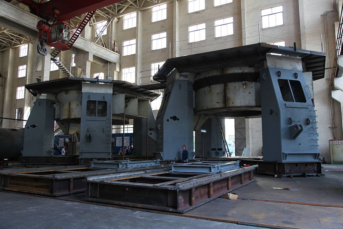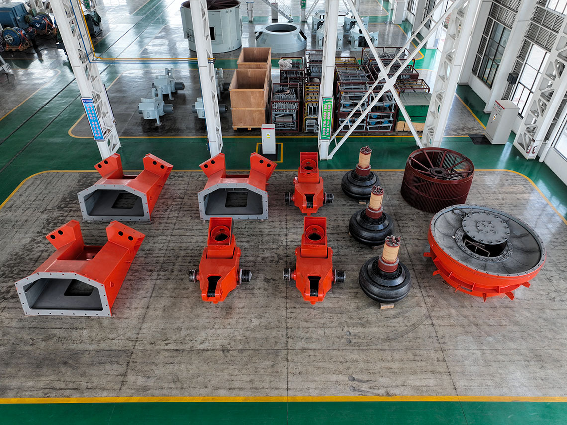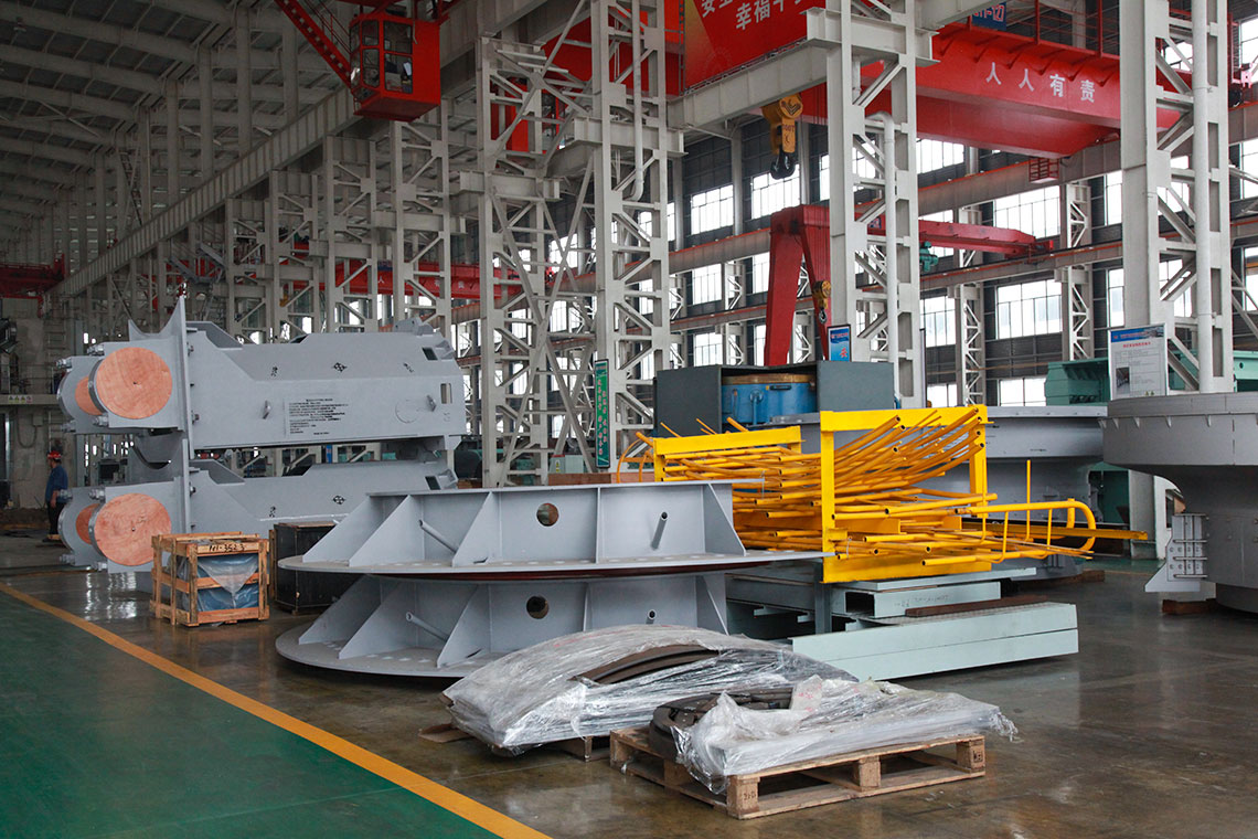 磨煤機(jī)三個(gè)磨輥由旋轉(zhuǎn)的磨盤帶動進(jìn)行碾磨作業(yè)。入磨物料經(jīng)中心落煤管落在磨盤上后,由旋轉(zhuǎn)磨盤產(chǎn)生的離心力將其輸送至碾磨輥道上碾磨。碾磨壓力由彈簧或液壓加壓裝置產(chǎn)生,通過靜定的三點(diǎn)系統(tǒng),碾磨力均勻地傳至三個(gè)磨輥,通過加壓系統(tǒng)壓力傳至基礎(chǔ)。煤粉的干燥和輸送利用熱風(fēng)來進(jìn)行。熱風(fēng)通過噴嘴環(huán)均勻分布于磨盤四周,將經(jīng)碾磨的物料干燥并輸送至磨機(jī)上部的分離器。物料的粗細(xì)粉在此分離,細(xì)粉排出磨機(jī),粗粉重新返回磨內(nèi)碾磨。物料中的一些不可破碎物可通過磨機(jī)下部的排碴口排出。磨煤機(jī)主要由基礎(chǔ)部,減速機(jī),下架機(jī),中架機(jī),磨盤,磨輥,加壓裝置,分離器,正壓風(fēng)密封裝置,蒸汽吹掃裝置等部件組成,還配有主電動機(jī),潤滑油站,液壓站和密封風(fēng)機(jī)等附屬設(shè)備,另備有慢速傳動裝置,安裝檢修專用工具,扶梯平臺,煤粉分配器,速斷閥等配套設(shè)備供用戶選用。磨煤機(jī)采用液壓加壓系統(tǒng),在運(yùn)行中即可對粉磨壓力進(jìn)行調(diào)整,并具有更好的過鐵保護(hù)性能。在原標(biāo)準(zhǔn)型的基礎(chǔ)上增加了磨輥翻出裝置,并提高了磨體的抗爆能力。